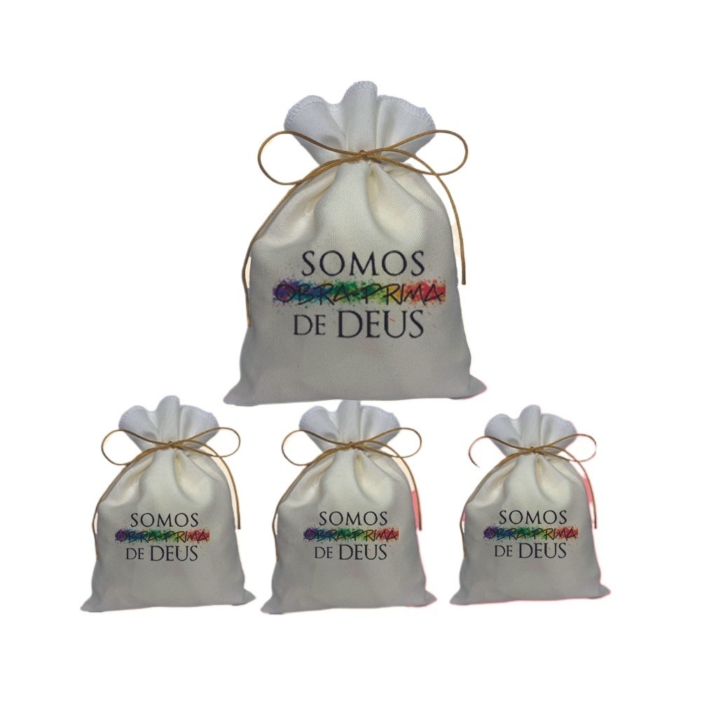 Saquinho personalizado em tecido Oxford – modelo Somos Obra Prima.
